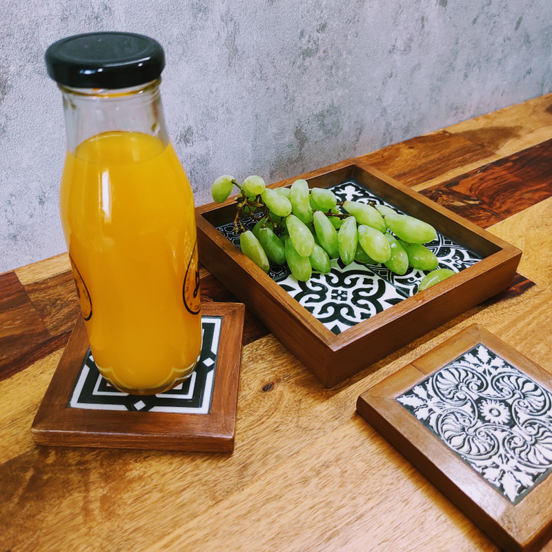 Black & white Tray Coaster Serving Set (1 tray, 2 coasters) with ceramic tiles & teakwood frames