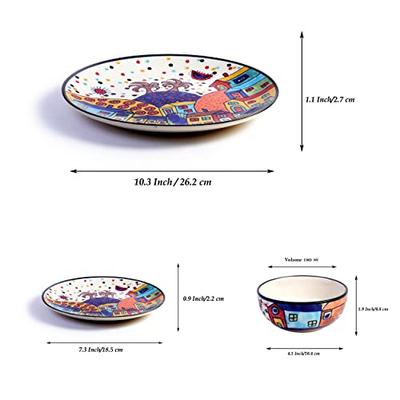★【 EASY TO CLEAN 】These dinner plates with katoris are ideal for serving daily meals to your family & guests.& Useful for dinnerware sets and sets of supper plates and bowls Hand-painted with a hut pattern. ★【 STYLISH AND STYLISH DESIGN -The katoris are ideal for serving curries, dal, vegetables, curd, dessert, etc.& Perfect to serve Dinner to your guests. The volume of each Katori is 180 ML & BOWL Dimension-PLATE-L*W*H=10.3*10.3*1.1 & BOWL-L*W*H=4.1*4.1*1.9 ★【 LEAD-FREE AND NON-TOXIC 】- The hand-painting on the ceramic will not wear away. – This is not a Bone China product. – There could be a slight variation in the glazing/color/finish on the product, as the glazing is done inside the furnace fired at 1200 degree celsius to make the product sturdy and due to the natural property of the studio glaze it is impossible to predict the color of the glazing/finish which will eventually come on the product after the firing process. All of our products are developed and created by our talented artisans utilising traditional methods from India, sustainably sourced materials, and exclusively by hand.
